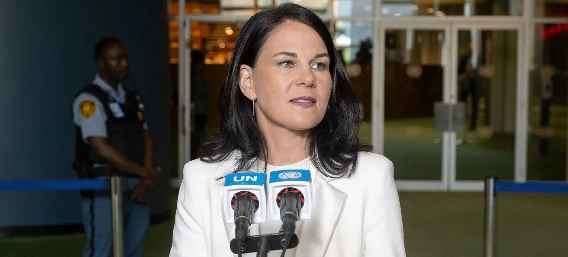 Annalena Baerbock, présidente élue de la quatre-vingtième session de l’Assemblée générale de l’ONU, s’adresse aux journalistes après son élection. Photo ONU/Eskinder Debebe